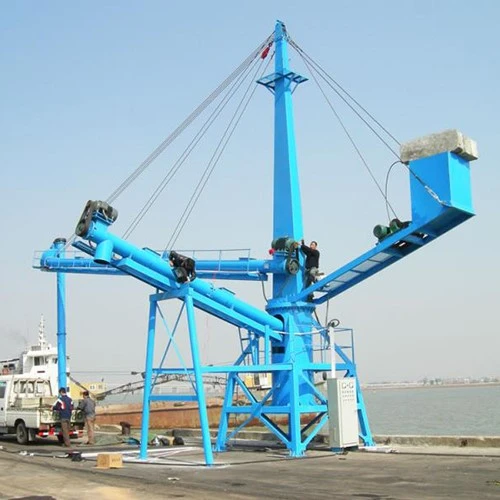 螺旋卸船机是一种利用螺旋机构的机械旋转将物料垂直提升并水平输送至码头上输送系统的散料连续式卸船机械。其主要由垂直臂架、水平臂架,转台、门架和喂料器等构件组成,其中垂直臂架和水平臂架上装有螺旋叶片式输送机,垂直臂架的头部设有反向螺旋喂料器。卸船能力在100t/h~3000t/h,适应船型500DWT~100000DWT。